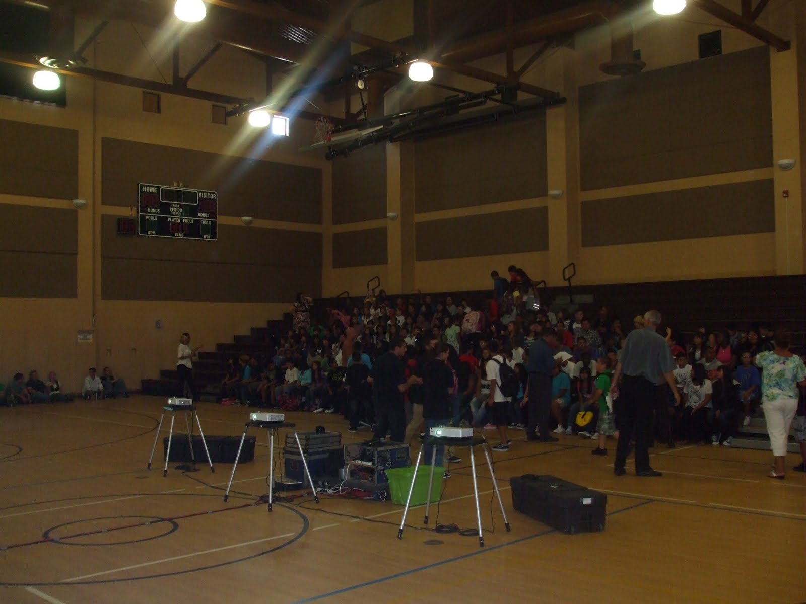 although we are not finished with training, we have the unique opportunity to have a test run in a real school!! below are pictures of our assembly that will give you an idea of what we are training to do out here in california! basically we set up everything that you see in the gym.